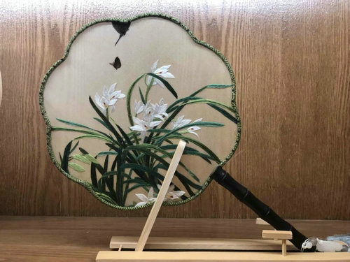 利用针线,在扇面上秀出自己喜欢的图案,留作纪念。