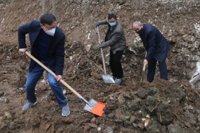 2月26日上午,在老君山检票系统前广场,记者看到的是一幅热火朝天、干劲十足的景象。有的挥锹挖坑,有的扶苗培土,有的浇水灌溉。人工难以作业的区域,挖掘机也派上了用场。在当前疫情防控依旧严峻的时刻,此情此景无疑为多日的疫情阴霾带来了春的气息!
