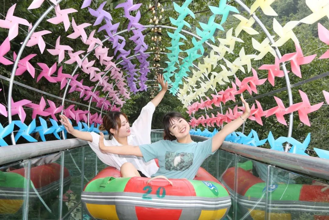 游客乘坐在橡皮艇上,感受天然氧吧带来的清凉惬意,在浓荫遮天的丛林中穿梭,享受到水滑山间走,人在画中游;洗肺吸氧在秘境,探幽体验圆追梦的清凉乐趣。